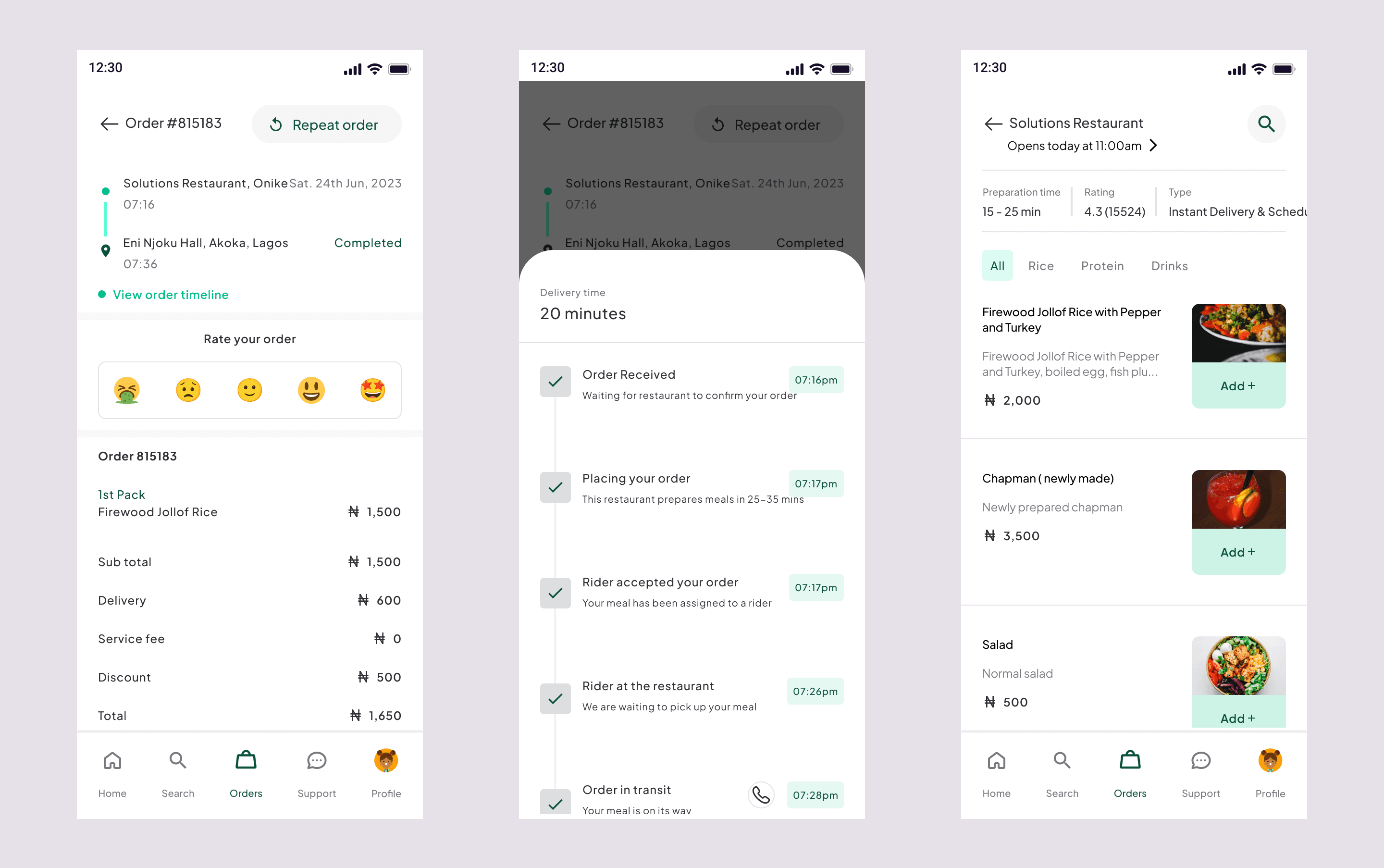 The order details page provides users with a comprehensive overview of their current and past orders. It displays essential information such as order date, items ordered, delivery address, and estimated delivery time. Users can track the real-time status of their order, from preparation to delivery. The order screen offers a dynamic interface that updates users on their order's progress in real-time. Users can see when the order is confirmed, being prepared, and out for delivery. Live tracking via a map interface allows users to monitor the delivery driver's progress, adding an element of excitement and anticipation. Estimated delivery time, driver contact details, and any special instructions are easily accessible on this screen.